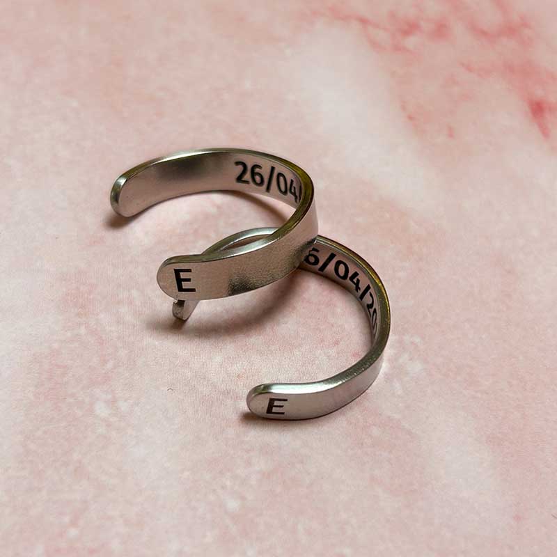 Celebra vuestra historia de amor con un anillo personalizado grabado a láser en acero inoxidable, un detalle único, elegante y duradero que simboliza vuestra conexión. Este anillo es ideal para parejas que quieren llevar un recuerdo significativo en su día a día, perfecto para aniversarios, San Valentín, compromisos o simplemente para demostrar cariño.