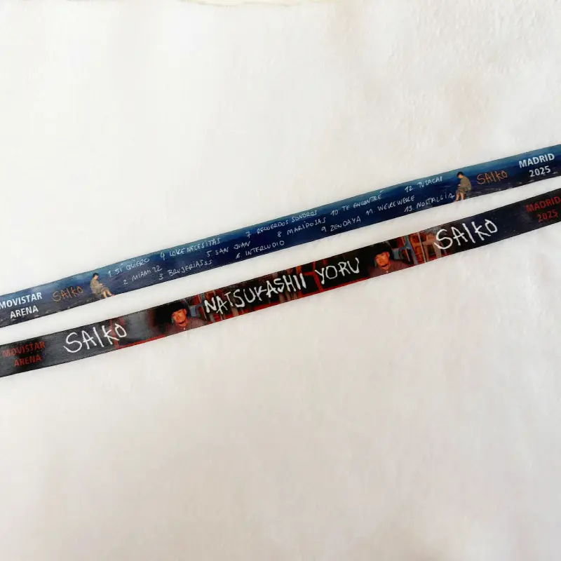 Esta pulsera de tela para conciertos y eventos está inspirada en el estilo único de Saiko, perfecta para fans que quieren llevar un accesorio con personalidad. Fabricada en tela de poliéster resistente y ligera, combina comodidad y durabilidad para acompañarte en festivales, fiestas o cualquier ocasión especial.